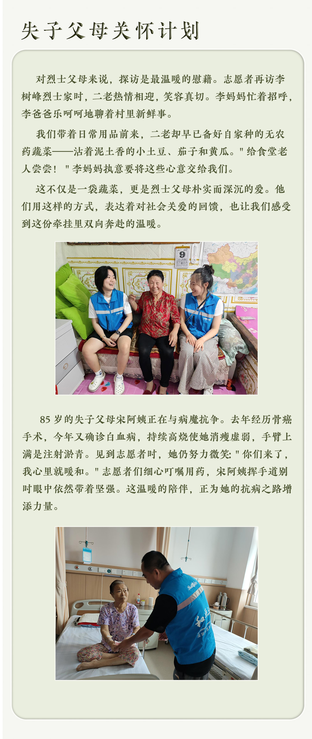 我们对各界热心人士表达衷心的感谢,感谢我们合作伙伴:腾讯公益、支付宝公益、阿里巴巴公益宝贝、灵析、微公益、抖音公益、滴滴公益、帮帮公益(以上排名不分先后),正是有你们的爱心,烈士父母的晚年生活才能得到改善。