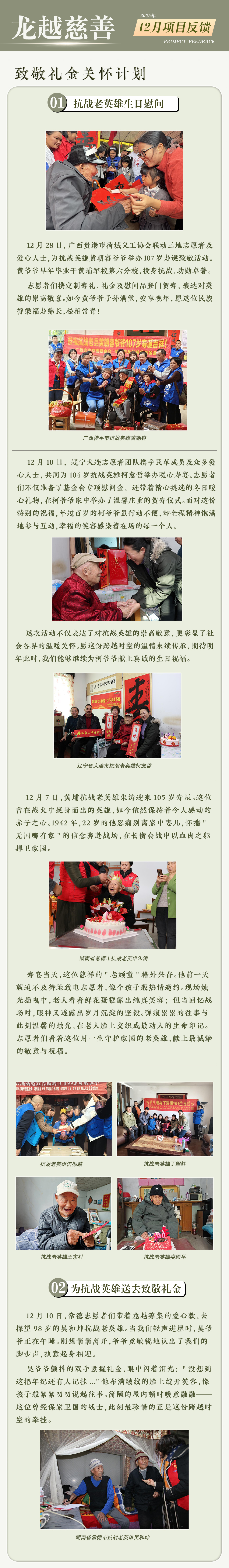 2025年12月,深圳市龙越慈善基金会 ”致敬礼金关怀计划”项目,共收到善款48,474.44元 ,受益老兵共 188人次。